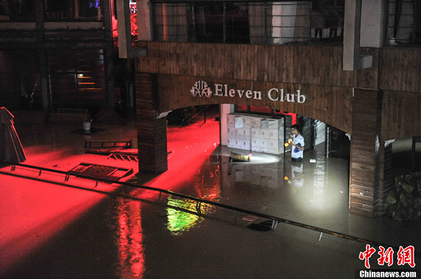 6月9日晚,广西南宁市出现大暴雨并伴有雷电,多条主干道遭水浸,交通受阻。当晚气象部门发布暴雨红色预警,并提示人员撤离至安全区域。图为被淹的民歌湖酒吧街。中新社发 洪坚鹏 摄