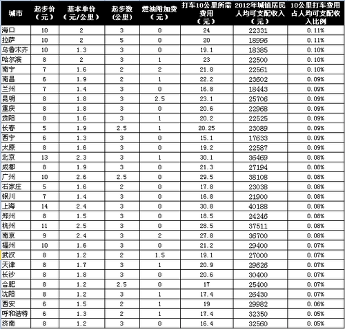 2、以上城市以“10公里所需费用占2012年城镇居民人均可支配收入”由高到低排序