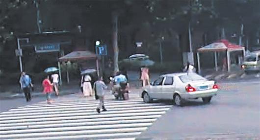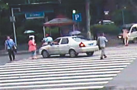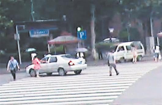 监控录像显示:6月26日18时32分30秒,身穿红色短袖上衣、半短裤的韩女士出现在画面中,准备从和平大道建设三路路口过马路。绿灯亮后,她顺着斑马线前行。32分45秒,一辆银灰色的小轿车从建设三路左转,向和平大道建设二路方向驶去,车辆打着左转灯。32分55秒,韩女士与小轿车近距两三米,她站在斑马线上没动,小车则放慢了速度,随后缓缓贴近韩女士。32分57秒,小车司机手伸出窗外,在与韩女士上身接触后,小车加速驶离。