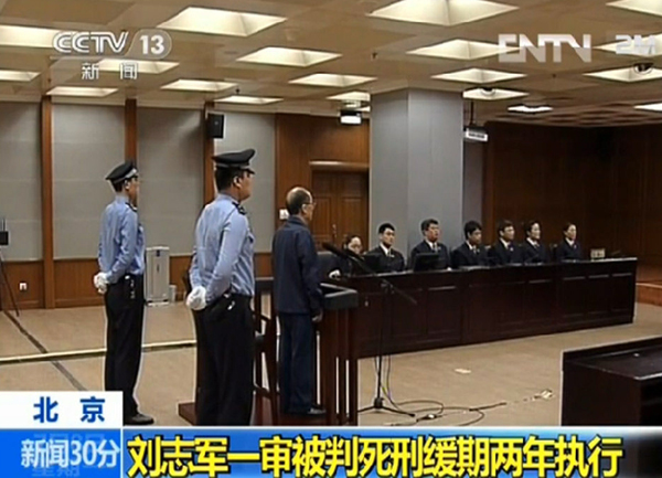 7月8日,原铁道部部长刘志军受贿、滥用职权案在北京市第二中级人民法院一审宣判。刘志军被法院以受贿罪、滥用职权罪数罪并罚,决定执行死刑,缓期二年执行。这是刘志军被带入法庭(6月9日摄,资料视频照片)。6月9日,北京市第二中级人民法院一审开庭审理原铁道部部长刘志军受贿、滥用职权案。新华社记者 公磊 摄