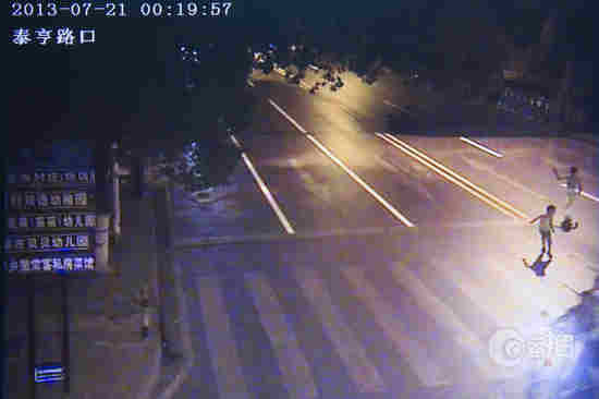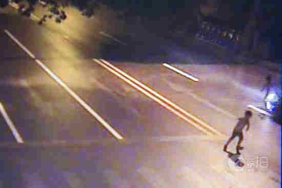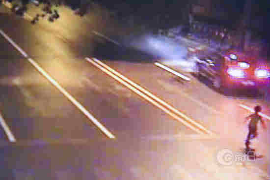 视频监控显示,两个小男孩慢慢地走到斑马线中间,突然,小冠群加速斜着跑向马路对面,并且离开了斑马线。随后,小冠群被一辆疾驰而过的汽车撞倒在地。