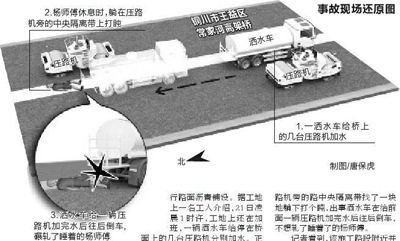 昨日上午,记者赶到事发现场建设中的铜黄高速第二通道铜川市王益区常家河高架桥施工工地,该大桥不久前合龙,正在进行路面沥青铺设。据工地上一名工人介绍,21日凌晨1时许,工地上还在加班,一辆洒水车给停在桥面上的几台压路机分别加水。正在这时,就听见有人喊:“不好了,碾着人了。”他跑过去一看,一名开压路机的师傅躺在地上,周围流了不少血。原来是洒水车刚从他身上压了过去。