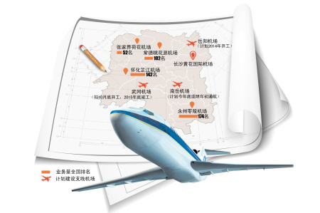 8月27日,邵阳武冈机场正式开展开工前准备工作,今年10月底确保正式开工。这座预计在2020年旅客年吞吐量达25万人次的国内支线机场,计划于2015年底竣工试飞。届时,湘中地区民用机场的空白将得以填补。另外,衡阳南岳机场已完成征地拆迁、土方施工等工作,计划于今年底或明年初通航。岳阳机场则计划2014年开工。
