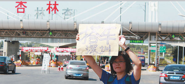 “搭车深圳”一张米黄色的硬纸板上写着四个大字,还特意加粗了字体。在昨天上午的烈日下,小符独自一人举着它,在沈海高速杏林入口处张望着。