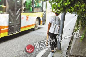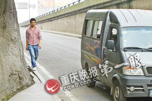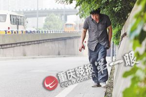 记者上前询问。男子名叫李术甲,今年51岁,在渝鲁大道做生意,每天往来这条人行道两次,这样绕柱而行的动作,他已经做了4年。“没得法,旁边就是公路,车又多,开得又快。抱柱子总比走公路安全。”李术甲很无奈。