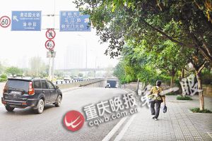 在渝北区渝鲁大道往江北区五里店立交桥方向的公路边,有一条人行道,市民想走过这条人行道,要克服三只拦路虎———路灯挡道、路面太窄、绿化植物挠头。