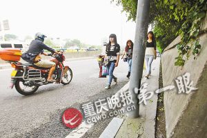 记者绕过了3盏路灯。还是靠山处,最窄的路段,人行道宽度只有15厘米,所幸,15厘米宽的路段只有1米左右长。要想通过,要么走一字步,要么侧身走螃蟹步。记者踏着一字路,颤颤巍巍走在最窄处,虽然脚在人行道上,但身体已经置身公路。往来车辆就从身边呼啸而过,双脚、手心已经出汗。走人行道,走出了横穿公路的紧张。