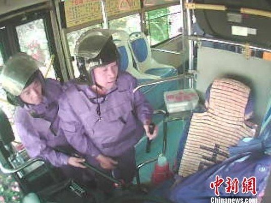图为李甲军被殴打瞬间,因车窗被砸碎,头发被车外现场拆迁执法人员拉扯,并遭猛击。两名现场拆迁执法人员通过公交车车厢中部的窗户爬上去,对他进行威胁。