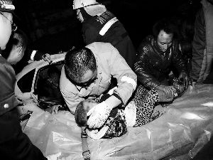 见此情形,消防官兵、民警和现场群众对轿车附近的煤炭进行清理,并协调当地铲车协同救援,同时利用无齿锯、剪扩钳等器具对车门进行破拆。当救援官兵打开车门后,眼前的一幕令人深深震撼:在后排座有三名被困者,一名女子平躺着抱着小孩,一名男子趴在女子和小孩身上,将两人护在身下。小孩不时发出哭喊声。救援人员当即决定先对小孩进行施救,20时52分,被困小孩被成功救出。随后经过救援人员两个多小时的不懈努力,其余被困者被全部救出。