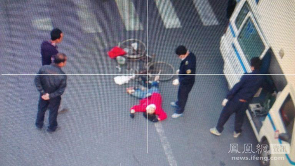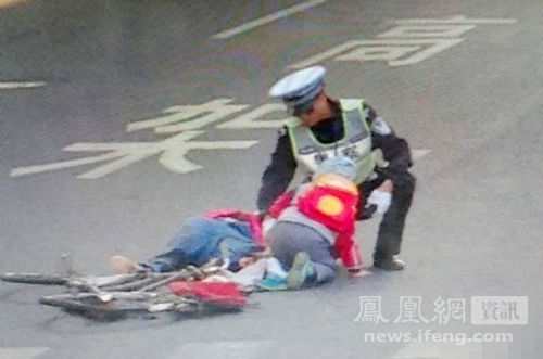 据目击者介绍,事发时,这辆肇事集卡可能是沿宝杨路西向东行驶,开到同济路后右转上同济路,就在开上同济路时,将正在过马路的一辆自行车撞倒并碾压,导致自行车上的一对祖孙受伤倒地。不幸的是,120赶赴现场后,外婆当场宣告死亡,背着书包的孙子受伤倒地,怔怔地看着死亡的外婆,120、110随即将孙子送医抢救。图为事故现场(网友@宣克炅摄)