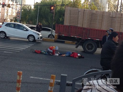 11月5日上午7点40分左右,上海宝山区宝杨路、同济路路口发生一起交通事故,一辆平板集卡在小转弯时,碾压一辆自行车,而自行车上外婆和孙子遭碾压一死一伤。图为事故现场(网友@上海新闻头条摄)。