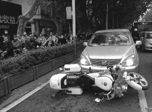 男子坐到驾驶室后,加了油门就冲出去了,向北往新街口方向开去。周曙光跨上警摩跟着追了出去。就在这个时候,三大队的交警张江宁开着警车经过路口,周曙光示意他赶紧跟上去。当商务车靠近中山南路淮海路路口时,因前方有车等红灯,男子只好停车。周曙光和张江宁一前一后堵住别克车。别克车却又向前撞倒拦在前面的警摩。