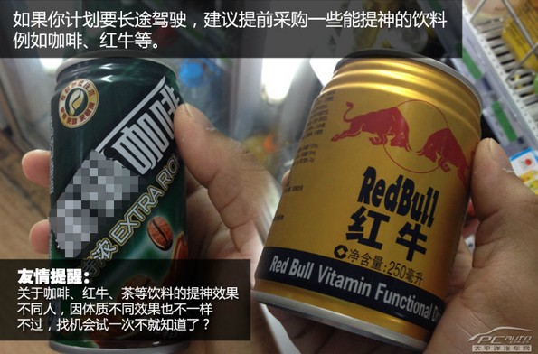 如果预备长途驾驶,最好是在车上准备一些提醒的饮料,例如红牛、茶、咖啡等。不过每个人的体质不一样,所以不同的饮料提神的效果也有差别,有些人觉得红牛比较提神,但是另外有些人却觉得咖啡比较提神。