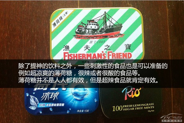 除了提神的饮料之外,一些刺激性的食品也是可以准备的,例如超凉爽的薄荷糖,很辣或者很酸的食品等。薄荷糖我不知道是不是大家都有效果,但是超辣或超酸的食品绝对有效果。