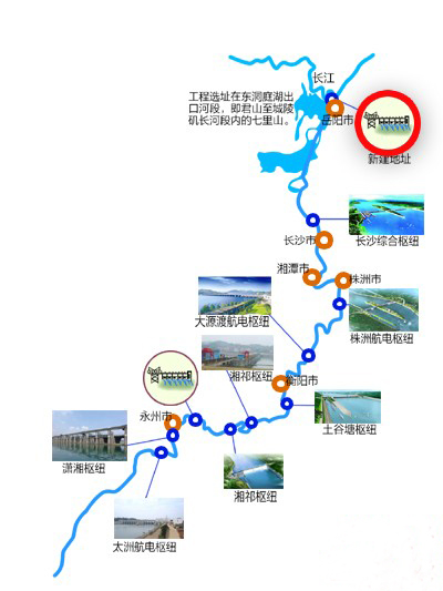 与在建的湘江长沙综合枢纽一样,洞庭湖岳阳综合枢纽也将分三期建设及导流,一期船舶走右侧主河床通航,二期船舶走中间束窄河床通航,三期船舶走已建船闸通航。枢纽施工总工期为75个月,船闸通航工期38个月,第一台机组发电工期61个月。