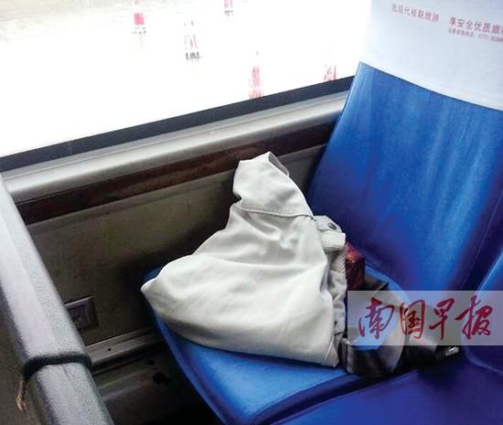 老人的衣服及所带物品仍在大巴座位上。死者家属供图