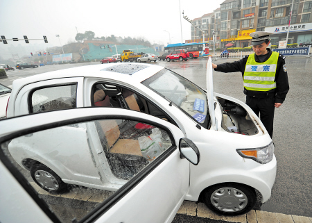 驾驶员王爹爹说:“这种车速度不快。春节前,女儿花了一万多元给我买了这辆车作为礼物。商家说是国家支持的新能源车,不用办证办照,交警不会抓。”