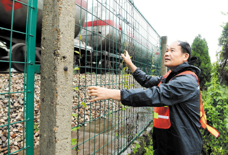 40多年来,彭立华每天都会在京广铁路线义务巡查。这是彭立华在查看铁路安全护网。石祯专 摄