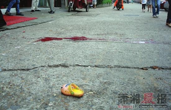 记者看到,一辆黄色拖车正在拖一辆红色的广州本田轿车,轿车牌号是湘A7971A,车底一摊很大的血迹流出车身外面。该车后面有一水渍,车底靠近右轮有一只卡通凉鞋,居民称,凉鞋是小女孩出事留下的。很快,这辆肇事车被拖离现场,记者看到,血迹有一米多长,血迹旁掉落着一个小果冻。