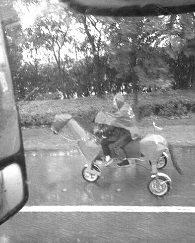 7月26日早上,网友乘衡阳开往衡阳县台元镇的客车,在315省道上拍下了这令人动容的一幕。也许是孩子太想骑马,父亲改装了这样的一辆“电动马”给孩子骑。“这个车应该是自己改装的,开得很慢,大概和行人走路的速度差不多。”网友说,当时天还下着雨,这位父亲让他感动。