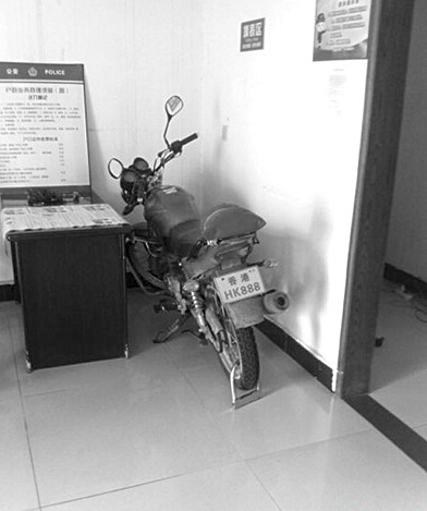8月4日上午9点左右,微博网友@罗文博去湘潭市公安局领取身份证时,看到一辆停放在大厅的摩托车,挂的车牌竟然是香港的,上面赫然印着:香港HK888。