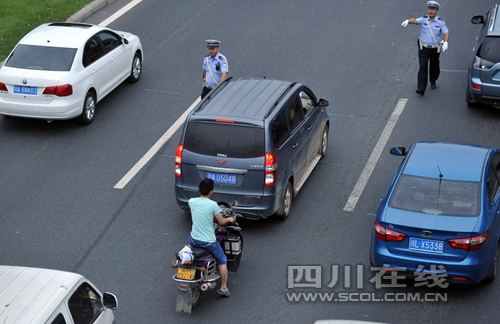 一名骑自行车的男子被拦下。该男子称,要赶时间去高新区上班,而三环路辅道车太多,他为了省时间侵走了三环主道。民警对他予以了30元罚款的处罚。