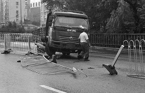 肇事的卡车停在道路中央,车头前方倒着一排护栏