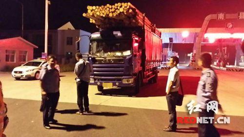 红网长沙8月13日讯(通讯员 陈畅 蒋中源))8月11日晚,湖南高速警察常吉大队柳叶湖中队民警进行日常巡逻检查时发现一辆拖运木材的货车正飞驰在道路上,货车所运送的木材密密麻麻、横七竖八地堆放在货箱里,三分之二的木材前后都伸出货箱,存在着超长的情况,给车辆的正常行驶造成了严重的安全隐患。民警一路喊话,要求货车司机立即在路旁港湾靠边停车,货车司机置若罔闻,甚至还超速行驶,企图甩掉警车。不多久,货车就驶入了常张大队武陵中队的辖区,武陵中队立即出警,派出警力进行全力帮助,并在辖区南县收费站做好了拦截准备。