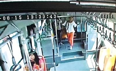 监控中,这名穿白色短袖和橘色裤子的女子坐在老胡坐过的座位上时,一名男乘客走近后排,她立刻将黑色塑料袋拿起放在自己腿上。