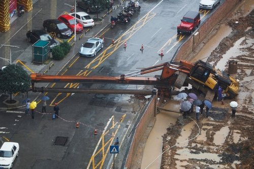 8月18日,五一广场附近,有上百吨重的旋挖机倒地,十多米高的钢架横倒在路上,所幸无人伤亡。图/记者 华剑