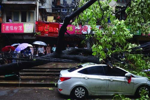 8月18日,长沙开福区通泰街,路边泡桐树倒塌,一辆汽车和两辆电动车被砸,同时造成附近多地区停电。图/记者 陈勇