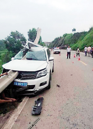 前天下午,江津区311省道上,一辆载有4人的大众途观轿车突然冲向路边护栏。一段约20米长的护栏从车头穿入,后档玻璃穿出。坐在副驾驶位、中年女司机的母亲不幸遇难。