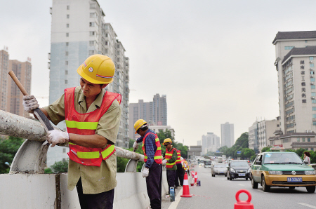 昨日,东风路高架桥启动综合整治工程,工人们正在对桥梁护栏进行修复。邹麟 摄
