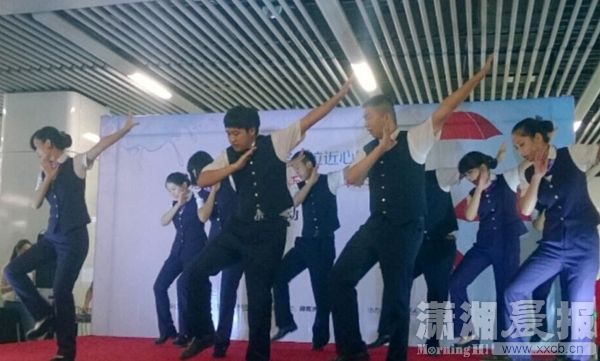 红网长沙9月2日讯(滚动新闻记者 夏盛)9月1日下午3点,长沙地铁五一广场站响起小苹果音乐,地铁工作人员跳起欢乐舞蹈,拉开长沙市轨道交通集团运营公司"爱心红雨伞、地铁便民卡"公益活动的序幕。