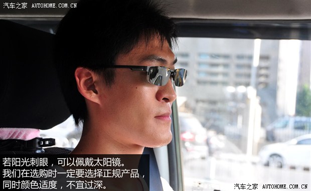 这里需要注意的是,我们在选购太阳镜的时候一定要在正规商家处购买,并且优先选择质量有保证的大品牌,因为质量不过关的太阳镜不仅不能保护眼睛,反而会带来更大的伤害。另外太阳镜的颜色最好不要太深,要保证佩戴眼镜后还能够看清仪表盘上的数字。