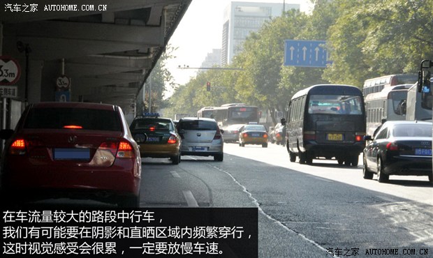 还有一种路况需要注意,一些狭窄的道路中,或是车多拥挤,再或者机动车和非机动车并没有明显的分界的路段,道路中阴影面积不是很规则的,往往驾驶员要在背阴和直晒的环境中频繁切换,视觉感受会更累。此时一定要放慢车速,注意观察两侧的非机动车及行人,保证驾驶安全。
