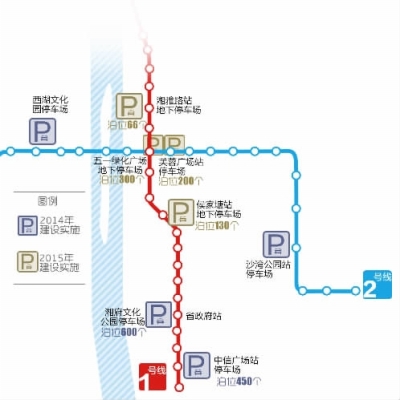 分别是湘府文化公园P+R停车场,位于湘府路-芙蓉南路西南角,泊位600个;地铁1号线中信广场站P+R停车场,位于韶山路-芙蓉南路东南角,泊位450个;地铁2号线沙湾公园站,位于劳动东路-白沙湾路西北角;西湖文化园停车场,位于枫林路与金星大道东北;芙蓉广场站停车场,位于五一大道与芙蓉路西北,泊位200个;五一绿化广场地下停车场,位于五一大道与黄兴路东北,泊位300个;湘雅路站地下停车场,位于湘雅路与黄兴路交叉口,泊位66个;侯家塘站地下停车场,位于劳动路,泊位130个。