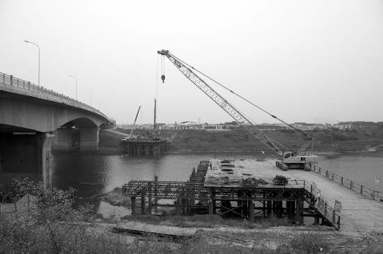 10月12日,长沙磁浮工程浏阳河大桥正在紧张施工。目前,水下桩基建设已基本完成。图/记者 谢长贵