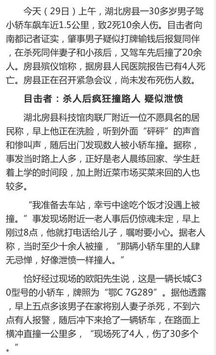 南方都市报【湖北男子疑杀人后夺车撞人医院称已死亡4人】今天上午,湖北房县一30多岁男子在杀死同伴妻子和小孩后,驾车先后撞了20余人。房县殡仪馆称,据房县人民医院报告已有4人死亡。目击者称,肇事男子疑似打牌输钱后报复同伴。但据当地媒体消息,肇事男子为房县本地人,动机疑似报复社会或吸毒。