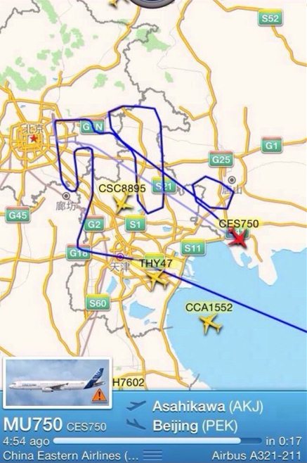在此后的MU750航迹中,记者看到,这架载客近200人的A—321并没有继续飞往济南,而是在河北承德和遵化上空盘旋多圈,而且之后MU750的航迹完全不规则。此时,民航内部、东方航空公司和备降机场如何协调记者不得而知,但MU750不规则的航迹首先被航空自媒体“FATLLL”发现,“FATLLL”于25日23时30分前后通过微博发布信息,称其监控到东航一家从日本旭川飞来的航班号为MU750的客机出现了不同寻常的情况。“FATLLL”的根据是,从MU750航迹图上所显示,这架从日本飞来的A—321从渤海上空进入中国大陆后直奔北京,但随后即掉转航向,并围绕北京上空往返飞行,航迹图上明显显示,MU750在北京和天津附近上空出现了两个圈状的飞行轨迹。