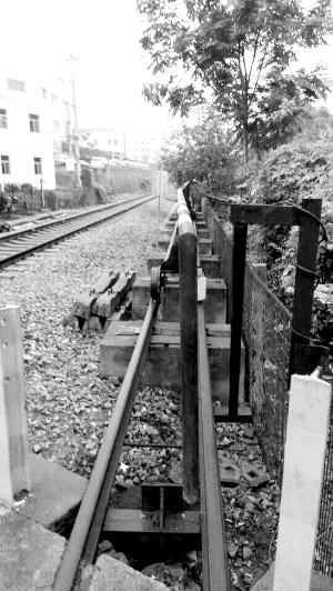 被道口工作人员临时搬到铁轨外的伸缩栏杆 报料人供图