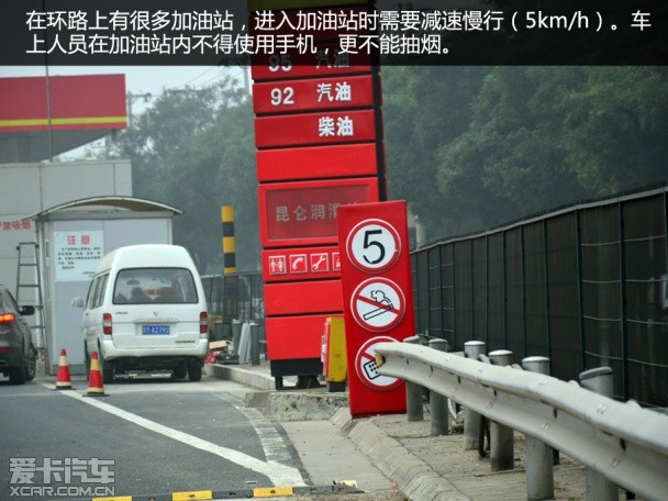 在环路上有很多加油站,在进入加油站时,需要减速慢行(5km/h)。车上人员在加油站内不得使用手机,更不能抽烟。另外,基于车辆出入安全的考虑,一般要求在加油站进出口30米范围内不能停车。