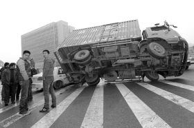1月10日,长沙市雨花区体育新城货运停车场附近,一辆货车由北向南行驶,先后与同向行驶的面包车、教练车发生碰撞。货车侧翻横在马路中间,车厢压在教练车右侧车门上,所幸没有造成人员伤亡。