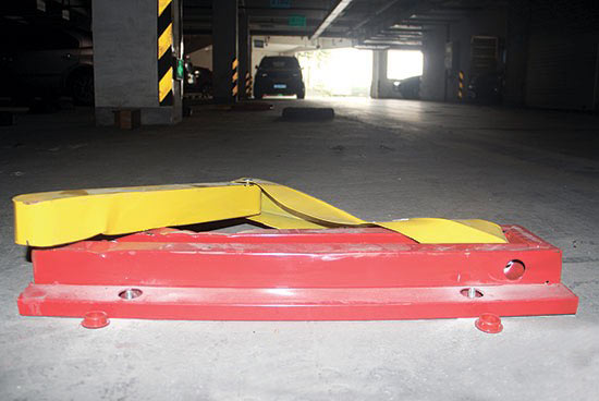 1月21日,金色比华利小区地下车库被损坏的A型车位锁。记者 李健 实习生 李际 摄