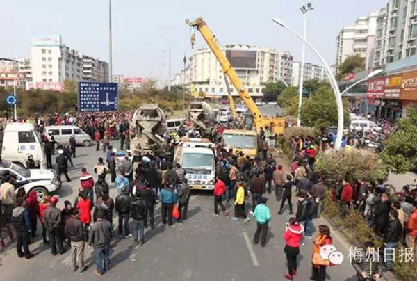 本报讯(记者 钟智跃)昨日中午11时46分,一辆水泥搅拌车行至梅县区梅州大桥西端圆盘时,因刹车失灵撞上前方小车后,再将其推至前面搅拌车,导致小车被碾压。车内两人不幸身亡。
