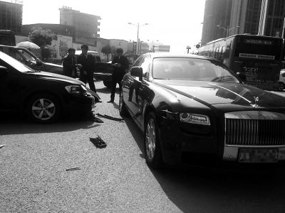 东快讯(记者 郑旭光)昨日中午12时许,在长乐市广场路,一辆黑色小轿车与价值500多万元的劳斯莱斯古思特相碰,两车不同程度受损。事故没有造成人员伤亡。由于豪车昂贵,黑色小轿车女司机叫来了开着价值百万元的玛莎拉蒂的朋友前来救场。