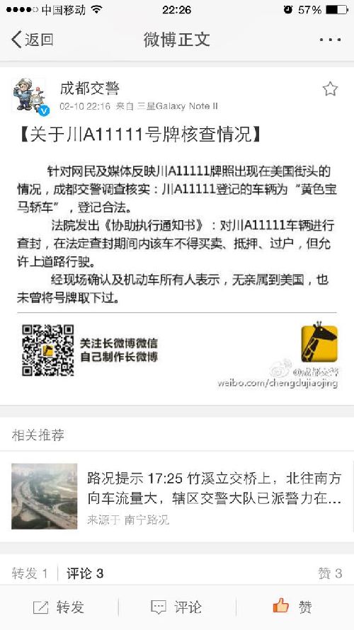今晚9时57分,成都市公安局交管局新浪官方微博回应:“针对网民及媒体反映川A11111牌照出现在美国街头的情况,经调查核实:川A11111登记的车辆为‘黄色宝马轿车’,登记合法……在法定查封期间内该车不得买卖、抵押、过户,但允许上道路行驶。经现场确认及机动车所有人表示,无亲属到美国,也未曾将号牌取下过。”据悉,该机动车所有人于去年12月9日,因前号牌污损在双流办理了一次补领机动车号牌,并交回了未污损的另一面“川A11111”号牌,按规定领取了一副重新制作的“川A11111”号牌。