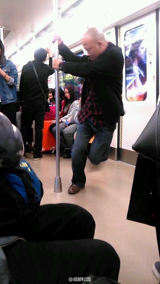 四川新闻网记者从网友的图片中注意到,地铁列车车厢内,该男子一身黑色外套搭配牛仔裤的打扮,耳机线从耳朵内延伸出来。男子面对扶手杆,叉开双腿、双手外推,忘情时双手在光亮的头顶摩挲。该男子的行为引发车厢中乘客围观,图片中即有乘客拿起手机拍摄。不过乘客的围观并未打搅他的兴致——最后该男子双手抓住车厢内的扶手杆,图片因为男子快速的绕动而虚化……