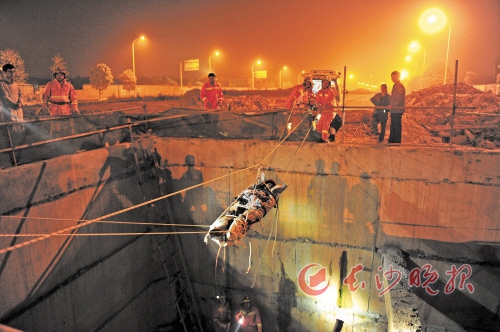 长沙消防官兵接到报警后紧急赶到现场,从深坑中救出受伤少年。长沙晚报通讯员 田效金 摄