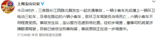 时刻新闻 —分享— 据上海市公安局宝山分局官方微博“上海宝山公安”消息,今日4时许,三泉路长江西路北侧发生一起交通事故,一辆小客车先后撞上一辆环卫电动三轮车,及停在路边的六辆小客车,致环卫车驾驶员当场死亡,六辆小客车不同程度受损。 事故发生后,宝山警方迅速到场处置。 经初步调查,肇事司机姚某涉嫌醉酒驾驶,目前已被依法刑事拘留,事故原因正在进一步调查中。 来源:人民网 编辑:谢娟